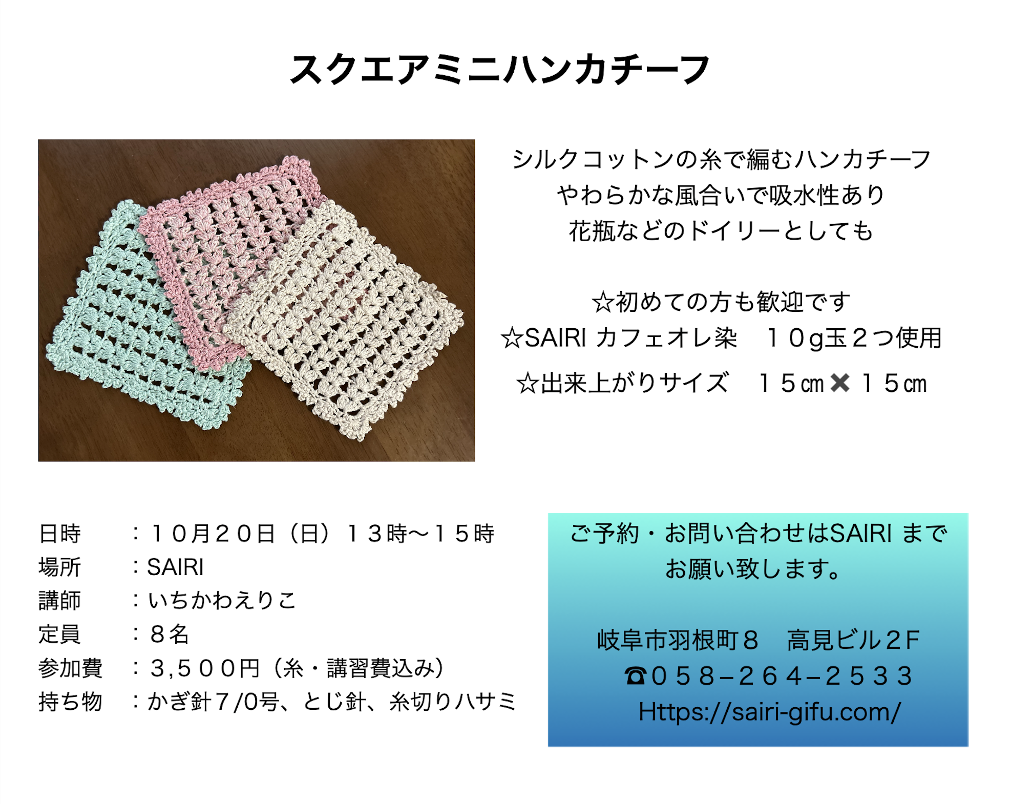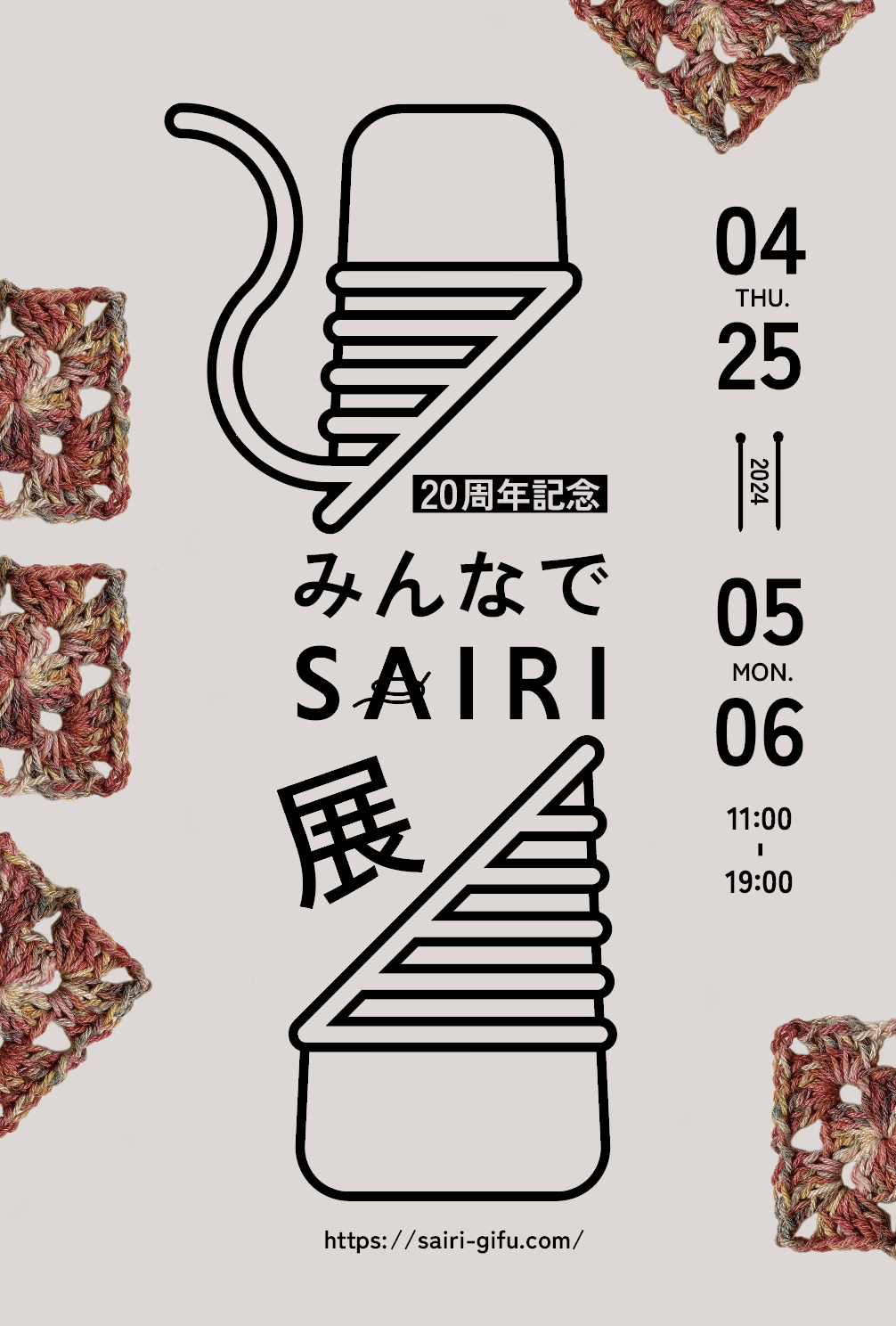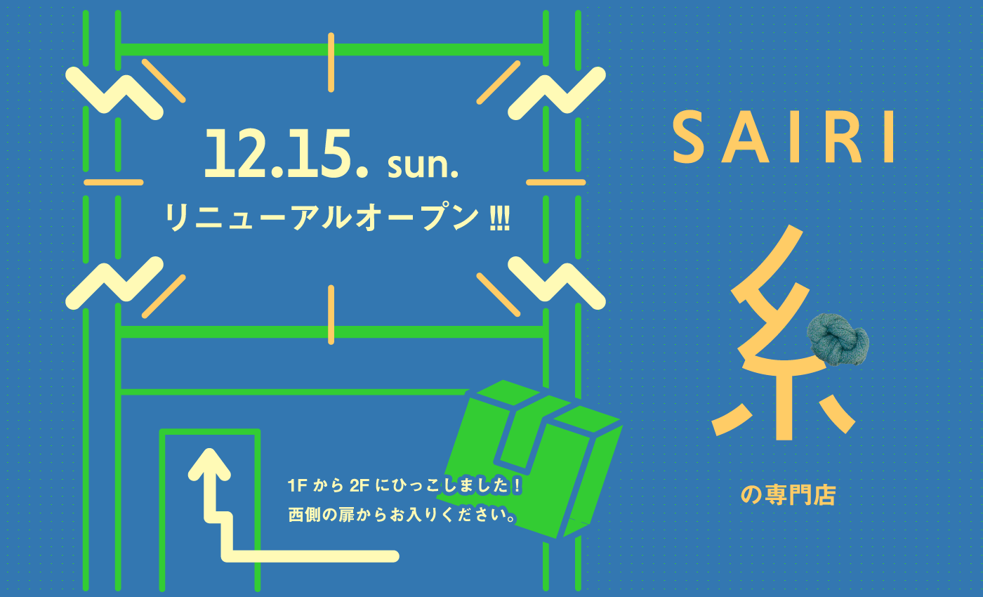 SAIRIオリジナル糸“カイト”を使ってみんなで小さなかぎ針編みモチーフを編みませんか?SAIRI20周年を記念して、店内を飾るモチーフつなぎの「SAIRIタペストリー」を作りたいと考えております。タペストリーの材料となる小さなモチーフの募集にあたり、モチーフの編み方とつなぎ方のワークショップを開催いたします。皆様のご参加をお待ちしております!