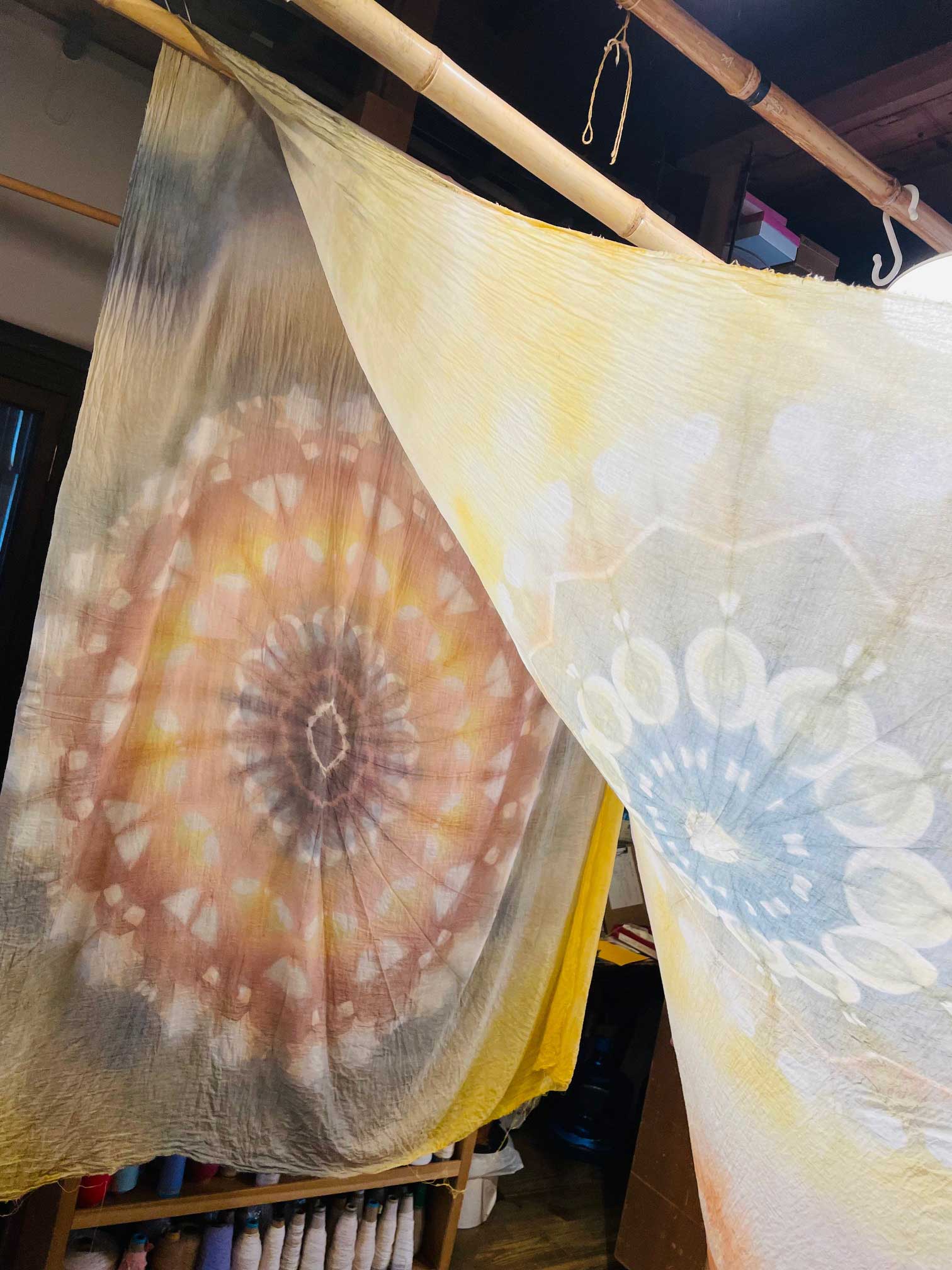 ベンガラは全部で25色の多彩な色が存在します。縄文・弥生時代から変わらぬ 製法、焼くことで色をつくります。その多色なベンガラや 藍錠染めで絞りやグラデーション など自由な染め方、色づかいでお持ち込み頂いた布やお洋服、Tシャツなど染めて頂きます。手ぬぐいも1点絞りや板締め絞りで染め上げます。